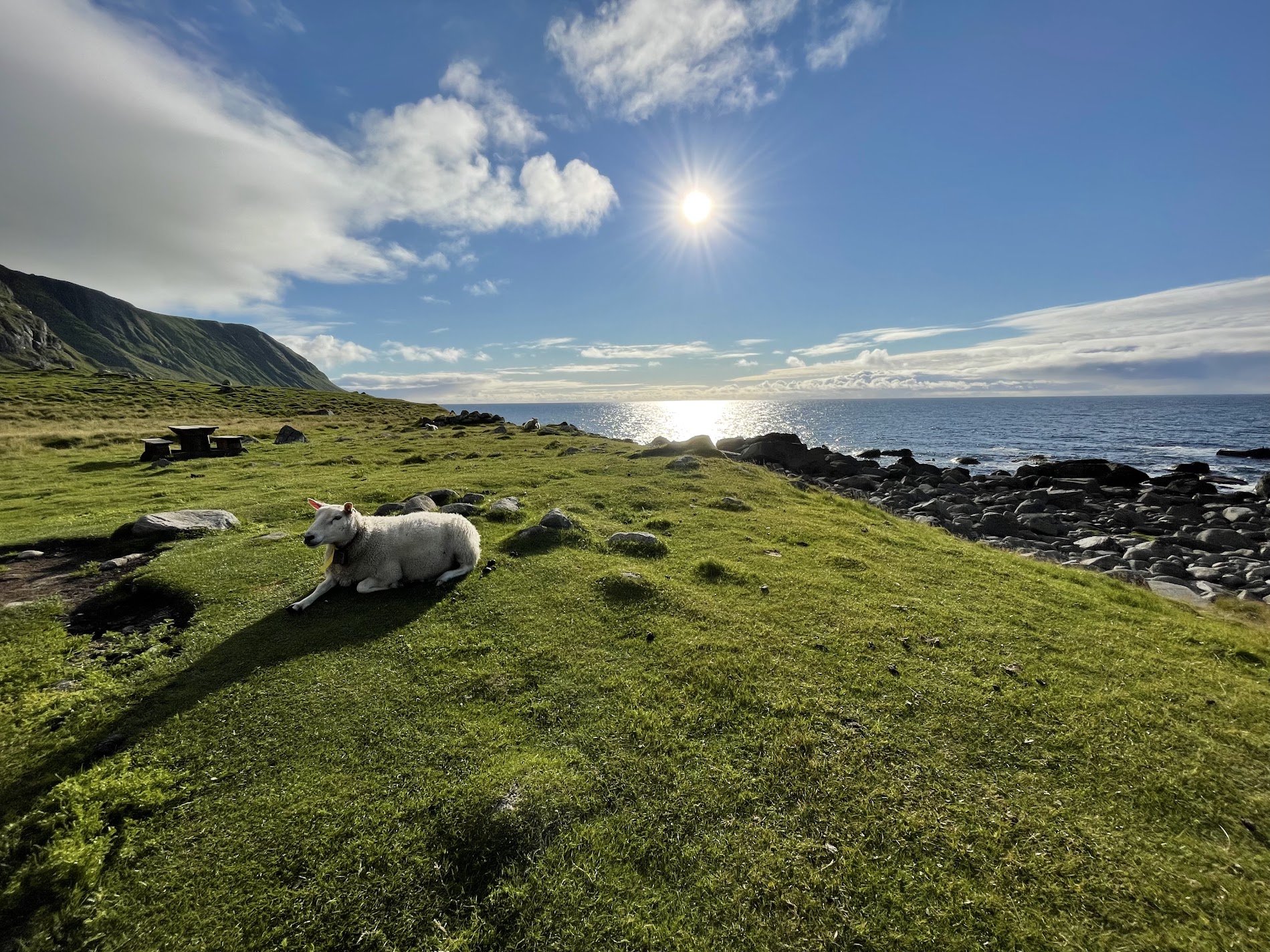 Ultimissima cosa generale riguarda i canetti: la Norvegia (e in misura appena minore anche la Svezia) non è esattamente un paese dove la gente impazzisca per i cani: se si ha in mente un posto caninamente civile come la Germania o il Regno Unito, la situazione è radicalmente differente. Non che ci sia aperta ostilità, chiariamoci, ma nei dettagli è impossibile non notare che i cani sono tollerati ma non idolatrati. Un esempio? Sui ferry (ne abbiamo presi un paio) il cane non può salire a bordo in area passeggeri, ma deve restare in auto (provate a dirlo a un tedesco o a un inglese, vi guarderebbe con due occhi così!), molte persone hanno paura del cane e gli altri cani che si incrociano sono tendenzialmente aggressivi. Credo (ma è una nostra interpretazione) che il cane qui sia vissuto più come un lavoratore (trainare la slitta, fare la guardia) che come un animale da compagnia e un amico: per evitare discussioni ricordate di tenerlo sempre al guinzaglio, anche perché le pecore sono ovunque e ovviamente non devono essere disturbate. Anche quando si sta facendo un’escursione in montagna e sembra una situazione ideale per slegarlo e farlo correre un po’, meglio evitare: abbiamo letto da più parti che i pastori locali non esitano a estrarre la doppietta. Iron è stato sempre legato, tranne quando ha fatto il bagno in mare o nei laghi, dopo che ci eravamo accertati che non ci fossero nei dintorni pecore, mucche o … renne!