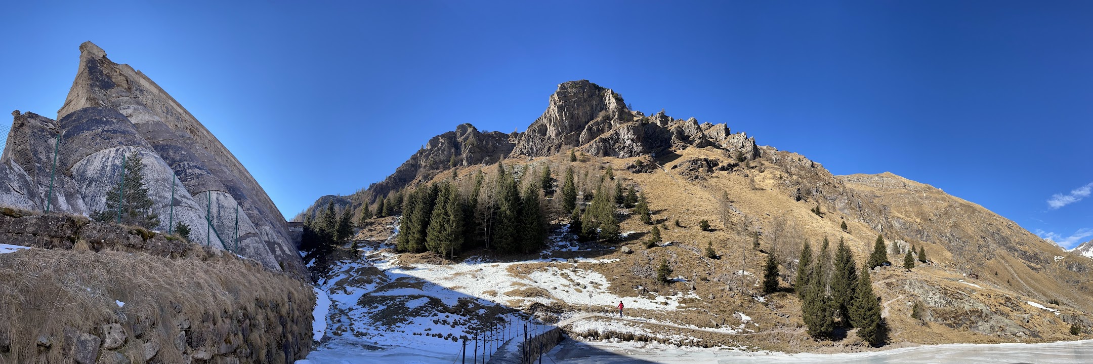Partenza al venerdì e sosta al leggendario Camping Patrice a Bratto (https://www.campeggiopatrice.it) che è uno dei nostri luoghi del cuore, essendo stato il primo campeggio dove siamo stati con Vanesio. Al mattino partiamo per la Val di Scalve, precisamente per la piccola frazione di Vilminore di Scalve chiamata Pianezza, dove troviamo un parcheggio (molto pieno, noi becchiamo l’ultimo posto disponibile) proprio all’inizio del sentiero CAI 411, che ci condurrà a ciò che resta della diga. La salita è particolare: il primissimo pezzo è estremamente verticale - anche se nettamente agevole grazie a un primo tratto di scalinata ricavata nella montagna e poi un bel sentiero battuto e molto curato. In poco meno di un km si passa da 1250 a 1500 metri, nel nostro caso sotto un sole spettacolare e caldissimo - soprattutto per essere a fine gennaio. Da lì in poi la strada si fa pianeggiante, lungo un fianco della montagna (alcuni pezzi possono mettere in imbarazzo chi soffre di vertigini - come me - ma sono assolutamente gestibili anche con bambini e cani) fino ad arrivare, in circa 2 km, ai ruderi, che si iniziano a vedere nella loro maestosità già a 800 metri dall’arrivo. Alcuni tratti del percorso erano ghiacciati, ma ancora una volte nulla di ingestibile. Sicuramente è una camminata da fare con scarpe da trekking serie, eviterei di farla in scarpe da tennis… e con il cane legato al guinzaglio, visto che la fauna selvatica è sicuramente presente: noi non la abbiamo vista, ma Iron ha annusato e tirato verso il bosco mille volte!
