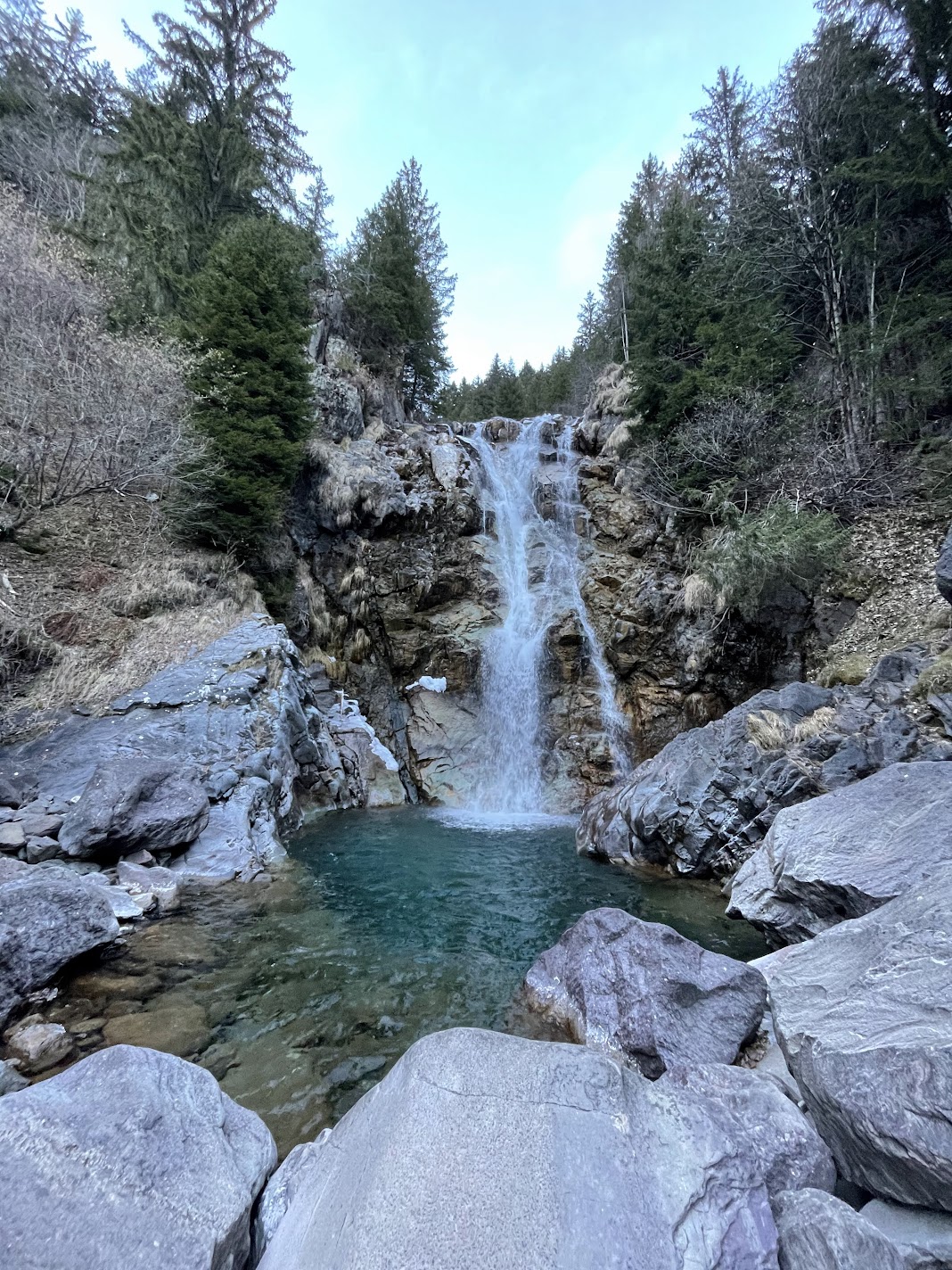 Tornati al van, ci accorgiamo che è ancora presto e decidiamo di allungarci fino a Schilpario per salire alla Cascata del Vò. Si tratta di un imponente salto di 25 metri disegnato dal torrente Vò. Si parcheggia poco prima di Schilpario, in località la Paghera e si imbocca il sentiero CAI 413/a. Il sentiero è molto battuto e quasi interamente lastricato, quindi si tratta di una vera passeggiata adatta a chiunque - sempre però con scarpe da trekking, che si snoda in un bosco di enorme fascino, con altissimi abeti rossi a fare da cornice e una distesa di verdissimo muschio. Per arrivare alla cascata occorre circa mezz’ora, il dislivello è dolcissimo (circa 100 metri complessivi in un km e mezzo) e quando si arriva si resta senza fiato: il salto è spettacolare e la pozza verdissima formata dall’acqua inviterebbe al tuffo - se non fossimo a gennaio!